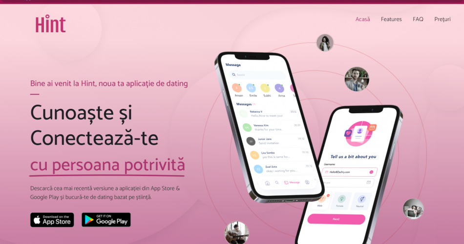 Hint Dating App (www.hint-app.ro) este o aplicație de dating și matching dezvoltată în România la inițiativa unui grup de psihologi și psihoterapeuți. Spre deosebire de orice alt instrument online – website sau aplicație – Hint garantează găsirea perechii ideale pe bază științifică. Respectiv, pe bază potrivirii profilului psihologic și a preferințelor sexuale.